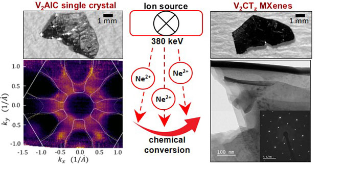 We use MAX phase single crystals to synthesize macroscopic MXenes, which are the largest class of 2D materials with a huge potential in many applications [2-4]. In collaboration with Institute Pprime, we introduce for the first time an approach to synthesize macroscopic V2CTz MXenes by employing ion-implantation strategy and using single crystal as a precursor material. The synthesized multilayers of V2CTz MXenes with lateral size exceeding 25 µm are the largest exfoliated MXenes flakes reported up to now. More importantly the conversion of V2AlC to 2D V2CTz takes 8 h which is 10 times lower as compared to typical protocols used for V2AlC powder exfoliation. This impressive reduction of etching time is related to the selective damaging of the Al layers induced by ion-implantation that drastically facilitates the chemical etching. This contribution opens new avenues for rapid synthesis of macroscopic MXenes layers and pushes forward the discovery of their fundamental physical properties.