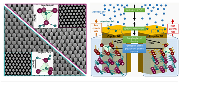 We have also revealed that Zn-polar ZnO nanowires elongate with a larger growth rate than O-polar ZnO nanowires. A theoretical modelling of the growth process has allowed us to attribute that difference to a larger surface reaction rate constant in the case of Zn-polar ZnO nanowires than in the case of O-polar ZnO nanowires [4].