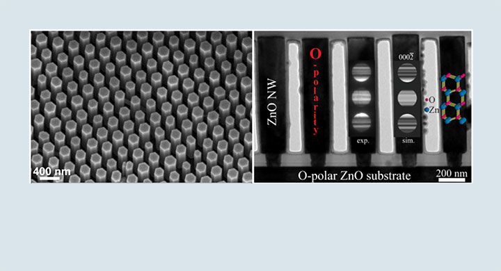 Controlling the polarity of ZnO nanowires in addition to their structural uniformity is critical for their real-world integration into electronic, optoelectronic, and photovoltaic devices. We have recently demonstrated, by combining selective area growth using electron beam lithography with low-temperature chemical bath deposition, the fabrication of epitaxial ZnO nanowire arrays with great structural uniformity and optical quality as well as with controllable homogeneous oxygen or zinc polarity.