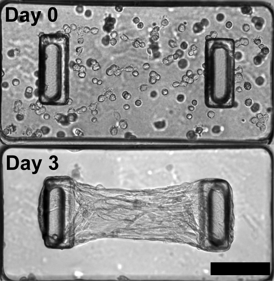 Actual in vitro models for skeletal muscle tissue engineering present many limitations for high content screening analysis: 2D models do not mimic the native cellular microenvironment, whereas 3D models require large amounts of cells, thus limiting the reproducibility of experiments. In our lab, we developed a microfabricated platform that enables the generation of arrays of 3D microtissues from low cell number while precisely controlling a large number of parameters, such as extracellular matrix composition, substrate rigidity, electrical or biochemical stimulations. Furthermore, this platform also allows to follow in real time microtissues contraction or calcium dynamics, as well as myoblast differentiation toward myotubes. Here, we demonstrate how tissue formation, stability, and cell differentiation in microtissues generated from immortalized human myoblasts can be improved by co-culturing the myoblasts with fibroblasts.