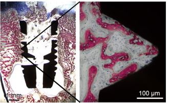 You will find here the paper by Raphaël Guillot. This is the abstract: "The aim of this study was to evaluate the osseointegration of titanium implants (Ti-6Al-4V, noted here TA6V) and poly(etheretherketone) PEEK implants induced by a BMP-2-delivering surface coating made of polyelectrolyte multilayer films. The in vitro bioactivity of the polyelectrolyte film-coated implants was assessed using the alkaline phosphatase assay. BMP-2-coated TA6V and PEEK implants with a total dose of 9.3 ?g of BMP-2 were inserted into the femoral condyles of New Zealand white rabbits and compared to uncoated implants. Rabbits were sacrificed 4 and 8 weeks after implantation. Histomorphometric analyses on TA6V and PEEK implants and microcomputed tomography on PEEK implants revealed that the bone-to-implant contact and bone area around the implants were significantly lower for the BMP-2-coated implants than for the bare implants. This was confirmed by scanning electron microscopy imaging. This difference was more pronounced at 4 weeks in comparison to the 8-week time point. However, bone growth inside the hexagonal upper hollow cavity of the screws was higher in the case of the BMP-2 coated implants. Overall, this study shows that a high dose of BMP-2 leads to localized and temporary bone impairment, and that the dose of BMP-2 delivered at the surface of an implant needs to be carefully optimized."