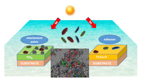 "The actual interest in developing light-induced catalytic coatings to act as an antibiofouling alternative has recently prompted interest in the incorporation of Cu into TiO2 films, working as a visible light sensitizer catalyst. TiO2 and new Ti-Cu-O films with Cu contents ranging between 16% and 75% Cu/(Cu + Ti) are deposited by aerosol-assisted metalorganic chemical vapor deposition at a substrate temperature of 550 °C. The films are composed of TiO2 anatase phase, mixed with Cu2O when including Cu in the composition. Pure TiO2 films’ morphologies are characterized by the formation of microflower-like structures with nanometric petals, which induce a high specific surface. These features are not present in Ti-Cu-O films. A UV-Visible study revealed that the optical band gap energy decreases with increasing Cu content. Interestingly, Ti-Cu-O films presented a highly photo-catalytic activity in the orange-G degradation. Marine biofouling field tests in Lorient’s Harbor in France and in vitro tests were carried out in order to evaluate the antifouling performance of the films, revealing that topography and chemical composition can act differently on different species. Field tests revealed that TiO2 microflowers reduced the fouling coverage. Besides, Ti-Cu-O films with 16 at.% Cu presented lower fouling coverage than films containing 58 at.% Cu. In vitro tests using two diatoms (P. tricornutum and N. perminuta) showed that the spaces between microflowers play a significant role in the adhesion of diatoms: microalgae adhere less when spaces are bigger than their cells, compared to when spaces are of the same size as cells. Films containing Cu did not alter N. perminuta growth nor adhesion, while they affected P. tricornutum by lowering its growth rate and adhesion without noticeable toxicity. Indeed, Cu-Ti-O is a very promising non-toxic fouling release film for marine and industrial applications."
