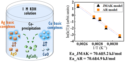 "AgCuO2 is an interesting semiconductor oxide with appealing optical and electronic properties. While the oxide has been synthesized in bulk by different approaches, no study of the formation mechanism has been carried out to date. We present an in situ time-resolved X-ray diffraction study of the hydrothermal synthesis of AgCuO2 from AgO and CuO. The effects of reaction pH and temperature on the reaction pathways and products have been studied. While the pH is a key parameter for the successful synthesis of AgCuO2, the temperature affects mainly the reaction kinetics. A reaction pathway is proposed that involves a series of dissolution–precipitation reactions, mediated by Cu and Ag hydroxy complexes. Finally, we have compared different approaches to obtain the reaction activation energy, which was calculated to be 70.6 ± 5.1 kJ/mol. Nevertheless, our results show that new models need to be developed for the type of reaction presented here."