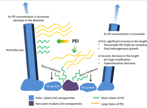 "The addition of polyethylenimine (PEI) in the standard chemical bath deposition (CBD) of ZnO nanowires has received an increasing interest for monitoring their aspect ratio, but the physicochemical processes at work are still under debate. To address this issue, the effects of PEI are disentangled from the effects of ammonia and investigated over a broad range of molecular weight (i.e., chain length) and concentration, varying from 1300 to 750?000 and from 1.5 to 10 mM, respectively. It is shown that the addition of PEI strongly favors the elongation of ZnO nanowires by suppressing the homogeneous growth at the benefit of the heterogeneous growth as well as by changing the supersaturation level through a pH modification. PEI is further found to inhibit the development of the sidewalls of ZnO nanowires by adsorbing on their nonpolar m-planes, as supported by Raman scattering analysis. The inhibition proceeds even in the low pH range, which somehow rules out the present involvement of electrostatic interactions as the dominant mechanism for the adsorption. Furthermore, it is revealed that PEI drastically affects the nucleation process of ZnO nanowires on the polycrystalline ZnO seed layer by presumably adsorbing on the nanoparticles oriented with the m-planes parallel to the surface, reducing in turn their nucleation rate as well as inducing a significant vertical misalignment. These findings, specifically showing the effects of the PEI molecular weight and concentration, cast light onto its multiple roles in the CBD of ZnO nanowires."