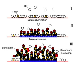 "Insulin is known to form amyloid aggregates when agitated in a hydrophobic container. Amyloid aggregation is routinely measured by the fluorescence of the conformational dye thioflavin T, which, when incorporated into amyloid fibers, fluoresces at 480?nm. The kinetics of amyloid aggregation in general is characterized by an initial lag-phase, during which aggregative nuclei form on the hydrophobic surface. These nuclei then lead to the formation of fibrils presenting a rapid growth during the elongation phase. Here we describe a novel mechanism of insulin amyloid aggregation which is surprisingly devoid of a lag-time for nucleation. The excitation of thioflavin T by visible light at 440?nm induces the aggregation of thioflavin T-positive insulin fibrils on hydrophobic surfaces in the presence of strong agitation and at physiological pH. This process is material surface-induced and depends on the fact that surface-adsorbed insulin can bind thioflavin T. Light-induced insulin aggregation kinetics is thioflavin T-mediated and is based on an energy transfer from visible light to the protein via thioflavin T. It relies on a constant supply of thioflavin T and insulin from the solution to the aggregate. The growth rate increases with the irradiance and with the concentration of thioflavin T. The supply of insulin seems to be the limiting factor of aggregate growth. This light-induced aggregation process allows the formation of local surface-bound aggregation patterns."