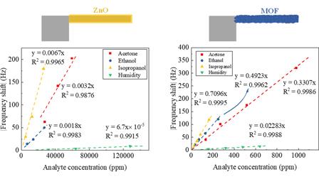 " A gas-phase technique, known as chemical vapor deposition of metal-organic frameworks (MOF-CVD), is used for sensitizing silicon cantilevers. These cantilevers are coated with a uniform and compact Zn(EtIm)2 (MAF-6) film, enabling the detection of volatile organic compounds (VOCs) through a change in the resonance frequency of the cantilever. The MOF-coated sensor exhibits remarkable sensitivity to VOCs within the 0.33–0.71 Hz/ppm range and a limit of detection (LOD) spanning from 4 to 9 ppb. Notably, these sensitivities surpass those achieved by ZnO-coated cantilevers by two orders of magnitude. This high sensitivity is attributed to the high porosity and large surface area of MAF-6. The approach employed in this work is compatible with conventional microfabrication techniques and offers an advantageous avenue for the development of highly sensitive gas sensors. "
