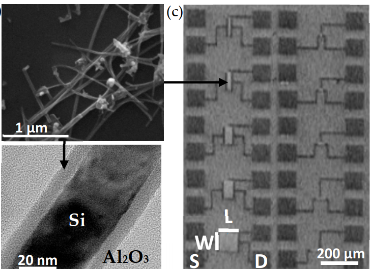 "Field effect transistors (FETs) based on networks of randomly oriented Si nanowires (Si nanonets or Si NNs) were biomodified using Thrombin Binding Aptamer (TBA–15) probe with the final objective to sense thrombin by electrical detection. In this work, the impact of the biomodification on the electrical properties of the Si NN–FETs was studied. First, the results that were obtained for the optimization of the (3-Glycidyloxypropyl)trimethoxysilane (GOPS)-based biofunctionalization process by using UV radiation are reported. The biofunctionalized devices were analyzed by atomic force microscopy (AFM) and scanning transmission electron microscopy (STEM), proving that TBA–15 probes were properly grafted on the surface of the devices, and by means of epifluorescence microscopy it was possible to demonstrate that the UV-assisted GOPS-based functionalization notably improves the homogeneity of the surface DNA distribution. Later, the electrical characteristics of 80 devices were analyzed before and after the biofunctionalization process, indicating that the results are highly dependent on the experimental protocol. We found that the TBA–15 hybridization capacity with its complementary strand is time dependent and that the transfer characteristics of the Si NN–FETs obtained after the TBA–15 probe grafting are also time dependent. These results help to elucidate and define the experimental precautions that must be taken into account to fabricate reproducible devices."