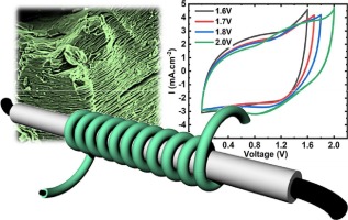 Here tou will find the article by Thierry Ouisse and Hanna Pazniak We developed a novel fiber-shaped supercapacitor based on a hybrid MXene@CNT//N-doped CNT device. In particular, for the first time, electrophoretically deposited Ti3C2Tx MXenes on carbon nanotube yarns and microwave-assisted nitrogen-doped carbon nanotube yarns are proposed as negative and positive electrodes, respectively. Short-circuit encountered during cell assembly was prevented entirely by coating a reproducible polyvinylidene difluoride (PVDF) membrane directly on the electrodes. Based on the developed electrodes, the assembled cell exhibited a large operating voltage window of up to 2.0 V in a diluted 0.5 M H2SO4 liquid electrolyte. The device displayed excellent stability over 5000 cycles with a Coulombic efficiency of nearly 100 %. The device withstood a floating test for 70 h with approximately 100 % capacity retention and exhibited excellent resistance to mechanical stress. Areal energy density as high as 298.5 μWh cm−2 was recorded for a power density value of 855.5 μW.cm−2 at an areal current value of 0.5 mA cm−2. At a high current density of 10 mA cm−2, the energy density remained high at 99.0 μWh cm−2 for a corresponding power density of 8.11 mW cm−2. The reported values rank among the highest obtained for carbon nanotubes-based wired-shaped supercapacitors and show the potential of this flexible wired-shaped hybrid energy storage unit as a wearable device.""