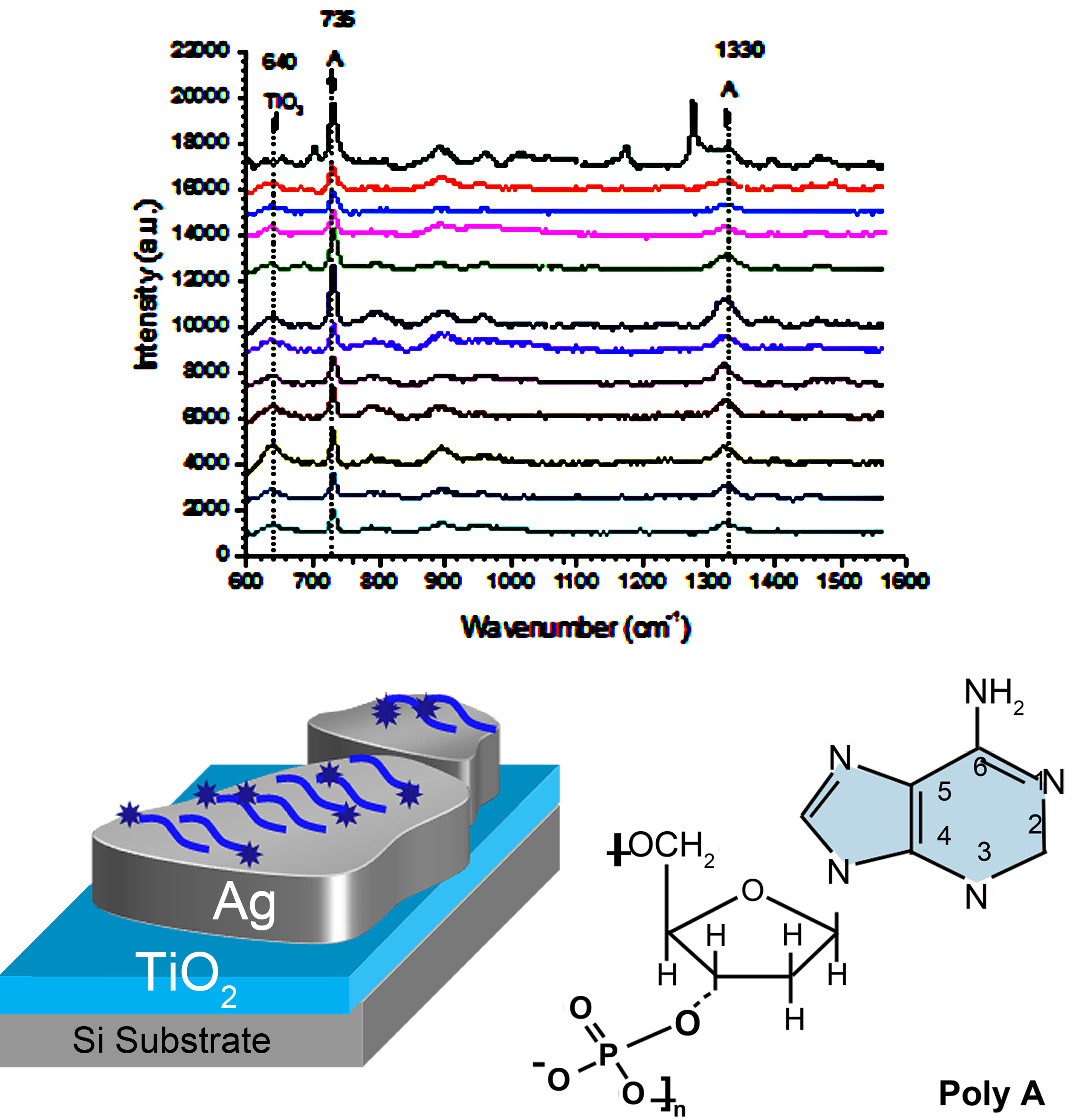 A new concept of low cost SERS substrate constituted of Ag NPs spread on TiO2 film has been developed and optimized (M. Langlet, LMGP). Thanks to its controlled fabrication, we are able to obtain very well resolved spectra with an excellent reproducibility over mm2 area of single stranded monobase and multibase oligonucleotides sequences as well as double stranded oligonucleotides.