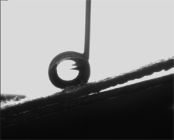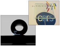 (Right) Transparent and superhydrophobic surface formed by nanosphere lithography : water contact angle ~160°, rolling angle < 1°.