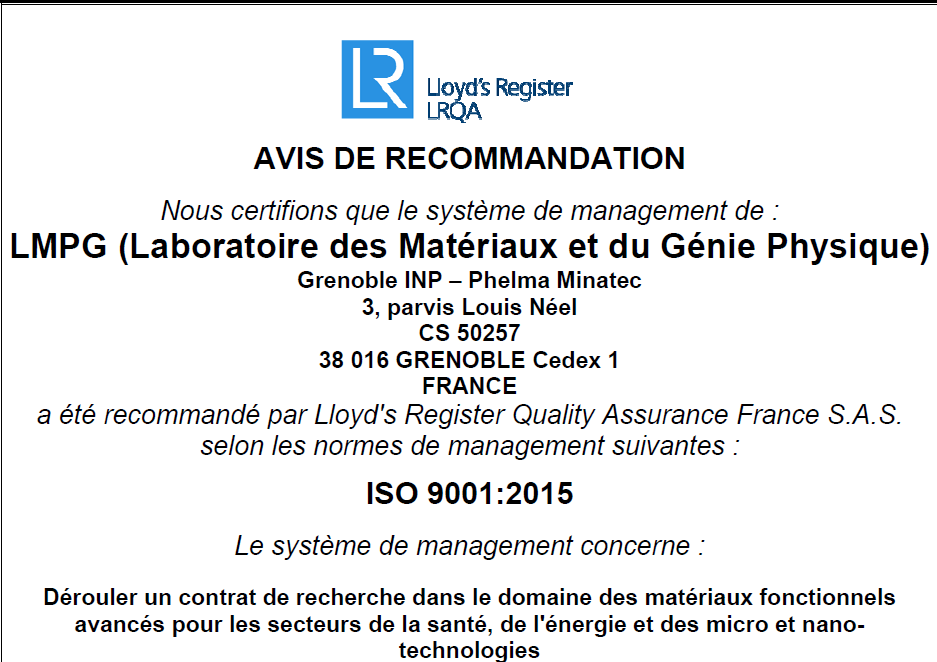 Le LMGP est recommandé à la certification pour la norme ISO 9001 versions 2008 et 2015 , pour le champ d’application « Dérouler un contrat de recherche dans le domaine des matériaux fonctionnels avancés pour les secteurs de la santé, de l'énergie et des micro et nano-technologies ».