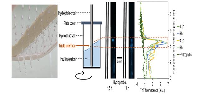 En utilisant des tiges hydrophobes trempées dans une solution protéique agitée, nous avons mis en évidence par fluorescence le dépôt privilégié et rapide d’agrégats protéique au point triple sur la tige, là où la solution protéique, la surface de la tige et l’air se rencontrent. Ce travail met en évidence les effets multiples de l’agitation sur une solution protéique exposée aux interfaces : au-delà des phénomènes sensibles au mélange des molécules en solution, l’agitation engendre une exposition répétée des protéines adsorbées à l’air et favorise leur agrégation. Ce mécanisme a des implications directes sur les précautions nécessaires dans les protocoles de manipulations des formulations contenant des protéines thérapeutiques afin de garantir leur stabilité, sujet qui est au coeur de nos collaborations avec Sanofi et Becton Dickinson.