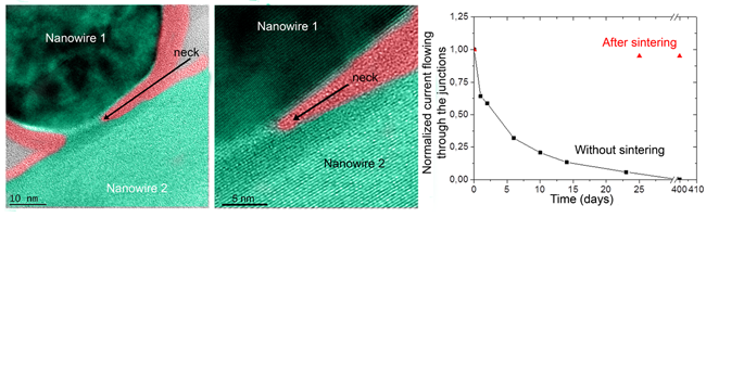 Comme l'illustre le graphique, après avoir été fritté par notre procédé, le dispositif présente une conductance constante dans le temps. Par contre en absence du frittage, le dispositif qui est conducteur juste après fabrication, voit sa conductance diminuer de façon continue jusqu'à atteindre un comportement isolant. De plus, comme le montrent les micrographies en microscopie électronique à transmission, il y a formation d’un col au niveau de la jonction nanofil/nanofil lorsque le frittage est réalisé et où l’on voit la continuité du réseau cristallin de silicium entre les deux nanofils. Cette observation microstructurale démontre l'impact indéniable de notre procédé de frittage en transformant l'assemblage de nanofils de silicium en un réseau polycristallin.