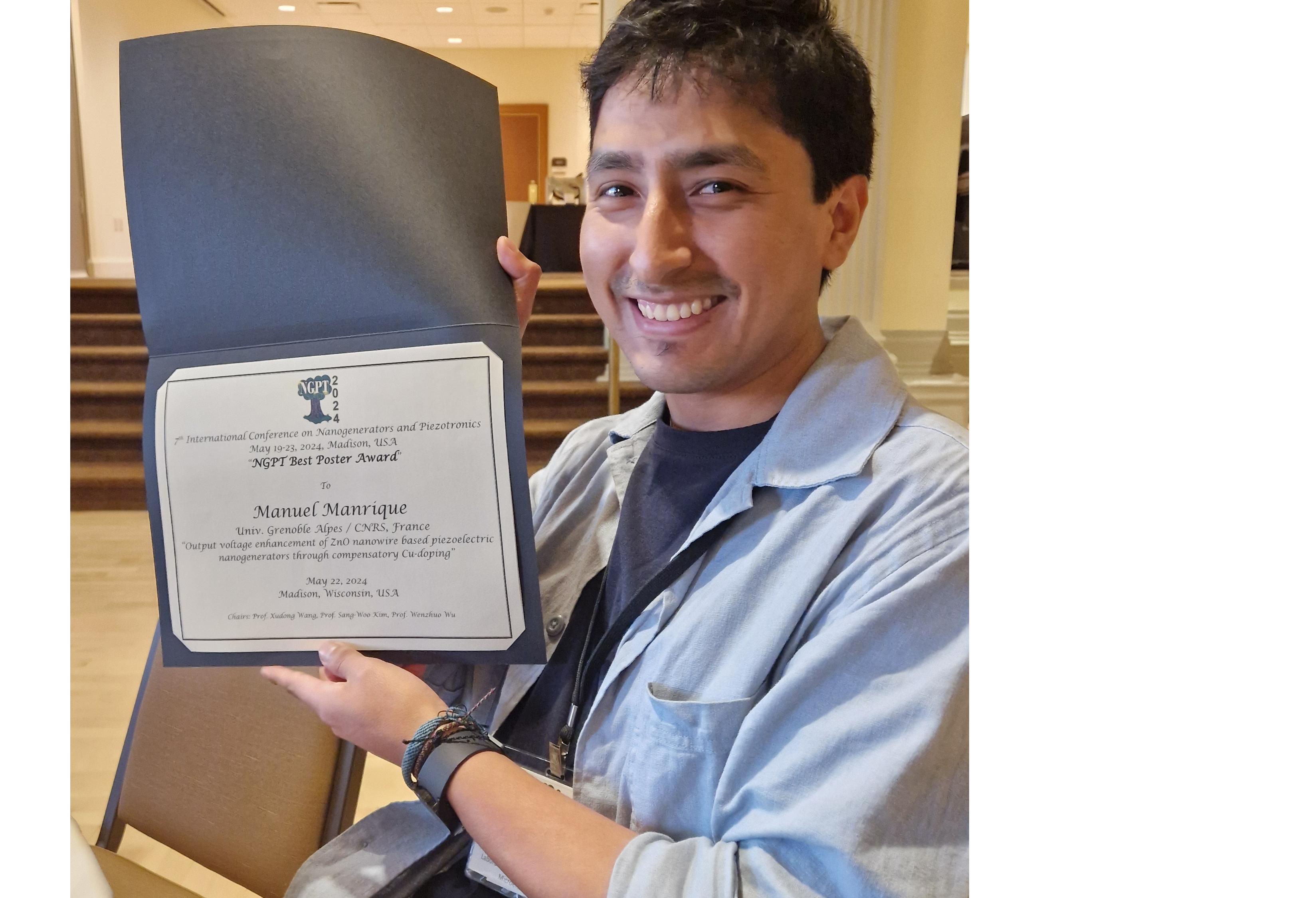 Manuel Manrique de l'équipe NanoMAT a reçu le Best Poster Award à 7th International Conference on Nanogenerators and Piezotronics (NGPT 2024, may 19-23 2024, Madison, USA), une conférence de premier plan dans le domaine, pour son poster intitulé "Output voltage enhancement of ZnO nanowire based piezoelectric nanogenerators through compensatory Cu-doping". Toutes nos félicitations Manuel !