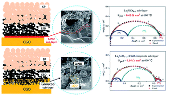 "In this work, a novel architecture of Ln2NiO4+d (LnNO; Ln ¼ La, Pr) cathodes is prepared on the Ce0.9Gd0.1O2d (CGO) electrolyte by sequentially using screen-printing (SP) and electrostatic spray deposition (ESD) techniques for the first time. Both LnNO samples crystallize into a single Fmmm orthorhombic layered Ruddlesden–Popper structure. The role of the electrode/air and electrode/electrolyte interfaces has been evaluated by impedance spectroscopy. A drastic reduction in polarization resistance (Rpol) from 3.33 to 0.42 U cm2 and from 0.83 to 0.08 U cm2 is obtained at 600 C for LaNO and PrNO, respectively, when the ESD electrode (with a dense thin, 100 nm, LnNO sub-layer) is topped by a SP current collector. A further Rpol reduction down to 0.16 and 0.04 U cm2 is successfully obtained for LaNO and PrNO, respectively, when the LnNO sub-layer is replaced by a thicker (3 mm) porous CGO/LnNO composite sub-layer. This composite sub-layer plays a main role in obtaining the best electrochemical properties of nickelates available in the literature, to the best of our knowledge.