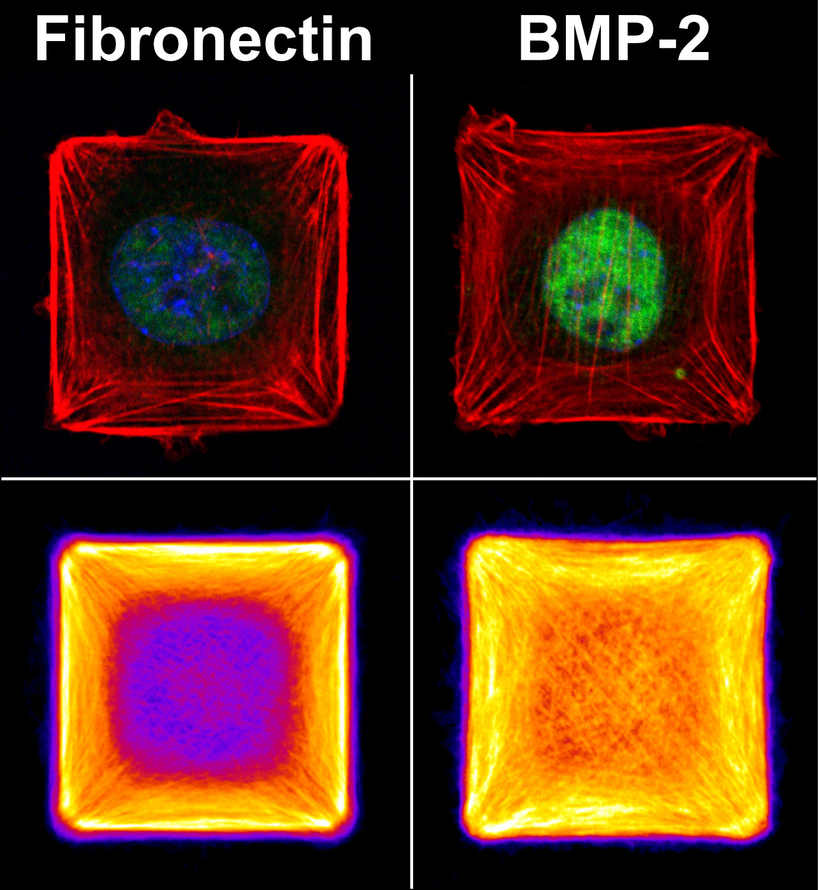 Here is Vincent's paper, and here is the abstract: In vivo, bone morphogenetic protein 2 (BMP-2) exists both in solution and bound to the extracellular matrix (ECM). While these two modes of presentation are known to influence cell behavior distinctly, their role in the niche microenvironment and their functional relevance in the genesis of a biological response has sparsely been investigated at a cellular level. Here we used the natural affinity of BMP-2 for fibronectin (FN) to engineer cell-sized micropatterns of BMP-2. This technique allowed the simultaneous control of the spatial presentation of fibronectin-bound BMP-2 and cell spreading. These micropatterns induced a specific actin and adhesion organization around the nucleus, and triggered the phosphorylation and nuclear translocation of SMAD1/5/8 in C2C12 myoblasts and mesenchymal stem cells, an early indicator of their osteoblastic trans-differentiation. We found that cell spreading itself potentiated a BMP-2-dependent phosphorylation of SMAD1/5/8. Finally, we demonstrated that FN/BMP-2-mediated early SMAD signaling depended on LIM kinase 2 and ROCK, rather than myosin II activation. Altogether, our results how that FN/BMP-2 micropatterns are a useful tool to study the mechanisms underlying BMP-2-mediated mechanotransduction. More broadly, our approach could be adapted to other combinations of ECM proteins and growth factors, opening an exciting avenue to recreate tissue-specific niches in vitro.