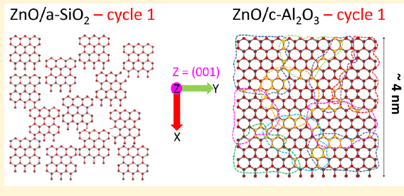 the atomistic mechanisms taking place during the first stages of the growth. We find that such mechanisms are surprisingly different for zinc oxide growth on amorphous (silica) and crystalline (sapphire) substrate. Ab initio simulations and quantitative data analysis allow the formulation of a comprehensive growth model, based on the different effects of surface atoms and grain boundaries in the nanoscale islands, and the consequent induced local disorder. From a comparison of these spectroscopy results with those from X-ray diffraction reported recently, we observe that the final structure of the zinc oxide nanolayers depends strongly on the mechanisms taking place during the initial stages of growth. The approach followed here for the case of zinc oxide will be of general interest for characterizing and optimizing the growth and properties of more complex nanostructures. "