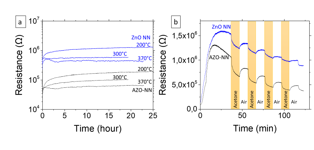 "This work reports on the transfer of randomly oriented nanowire networks based on ZnO and Al-doped zinc oxide (AZO) encapsulated ZnO nanowires onto a complementary metal oxide semiconductor (CMOS) micro electro mechanical system (MEMS) platform. The substrate consists of an embedded tungsten micro-heater with gold interdigitated electrodes on top of the membrane. The presence of the micro-heater allows to control the operating temperature of the metal oxide material whilst the electrodes are used to measure the resistance across the sensing layer. These networks, also called nanonets, are prepared using simple technological steps: (i) nanowire growth, (ii) nanowire dispersion and (iii) nanowire filtration. The characterization of the resulting devices demonstrated for the first time that the transfer of the nanonets on the suspended membrane devices is feasible and does not cause any mechanical failure. Bench testing showed that the resistance of the nanonets respond to the modulation of the operational temperature in line with the semiconductor behaviour of the film. An operational temperature of 370°C was chosen thus to tune to the resistance in the range of the MΩ and carry out further gas testing which demonstrated that the sensor resistance changed upon exposure to 1.5 ppm of acetone. These tests showed that ZnO and AZO-passivated ZnO nanonets have sensitivity of [1.2-1.3] and [1.1-1.2], respectively, as measured by the ratio between the resistance in air and gas. It was also observed that the sensitivity of the devices prepared using the encapsuled nanonets is more stable than the bare ZnO nanonets."