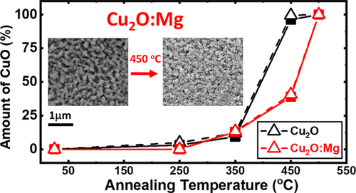 " This study reports the influence of magnesium incorporation into cuprous oxide (Cu2O) on its transformation into cupric oxide (CuO). Thermal treatments under oxidizing conditions are performed on undoped and magnesium-doped cuprous oxide thin films, Cu2O and Cu2O:Mg respectively, deposited by aerosol-assisted metal–organic chemical vapor deposition. The oxidation kinetics of these films shows a slower rate in the Cu2O:Mg system, since the complete oxidation into CuO occurs at a higher temperature when compared with undoped Cu2O. The increased stability of Cu2O:Mg can be explained by the inhibition of the formation of split copper vacancies, the defect most frequently associated with the CuO nucleation. Annealing treatments performed on Cu2O thin films provide new insights on the dopant influence on the mechanism to generate simple and split copper vacancies as well as the transformation of Cu2O into CuO. "