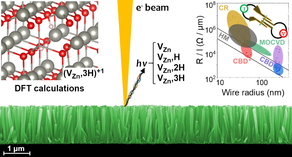 " Crystal defects in unintentionally doped ZnO nanowires grown by chemical bath deposition (CBD) play a capital role on their optical and electrical properties, governing the performances of many nanoscale engineering devices. However, the nature of these crystal defects is still highly debated. In particular, the hydrogen-related defects have not been explored in detail yet although the growth medium operates in aqueous solution. By using four-point probe resistivity measurements, we show that ZnO nanowires grown by CBD using zinc nitrate and hexamethylenetetramine exhibit a high electrical conductivity with electron densities ranging from 2.7 x 1018 to 3.1 x 1019 cm-3. Most of them have a metallic electrical conduction. By combining density-functional theory calculations with cathodoluminescence and Raman spectroscopy, we reveal that the high electrical conductivity mostly originates from the formation of interstitial hydrogen in bond-centered sites (HBC) and of zinc vacancy – hydrogen (VZn-nH) complexes. In particular, the HBC and (VZn-3H) complex are found to act as two shallow donors with a very low formation energy, for which the most stable configurations are reported. Additionally, this combined theoretical and experimental approach allows us to revisit the highly debated origin of the visible and ultra-violet emission bands in the luminescence spectra. They are found to be mostly related to VZn and (VZn-nH) complexes located in the bulk and on the surfaces of ZnO nanowires. These findings represent an important step forward in the identification of the predominant native and extrinsic defects driving the electronic structure properties of ZnO nanowires grown by CBD. They further reveal the significance of hydrogen engineering to tune the source of crystal defects for optimizing the physical properties of ZnO nanowires."