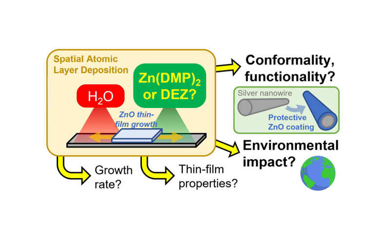 "Spatial atomic layer deposition (SALD) is a promising thin-film deposition technique that enables fast, large-scale deposition and nanoscale thickness control by utilizing spatially separated precursor vapors and a substrate-specimen relative motion, while being feasible in atmospheric pressure conditions. This study explores the use of a non-pyrophoric precursor, Zn(DMP)2, in open-air SALD to produce ZnO, and compares the SALD processing speed, thin-film properties, as well as the environmental impact of using this precursor versus the more conventional diethylzinc (DEZ), whose pyrophoricity discourages open-air processing. For this purpose, a life cycle analysis (LCA) study was carried out. Our investigation shows that Zn(DMP)2 open-air SALD can yield ZnO films faster than conventional ALD using DEZ producing high purity ZnO films at a rate of 0.7 Å at 180 °C, which corresponds to 184 Å/min maximal growth rate. Emphasizing practical applications, the conformality of the ZnO coating produced around silver nanowire (AgNW) networks by Zn(DMP)2 open-air SALD and the functionality of these protective coatings has also been demonstrated. The resulting transparent conductive nanocomposites had a substantially improved durability on par with their DEZ-synthesized counterparts."