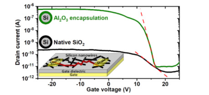 "Motivated to produce reliable and performant SiNW-based transistors, we present in this work how percolating networks composed of randomly oriented SiNWs, called nanonets, are a promising material if they are well engineered. We demonstrate that a proper material engineering of nanonets via alumina encapsulation allows to drastically enhance the electrical characteristics of back gate field effect transistors (FETs). Based on a simple, low temperature (≤400 °C) and up-scalable process of integration, the fabricated FETs exhibit a low off-current in the picoampere range while maintaining very good on-performance, up to the microampere and thus on-to-off ratio exceeding 105. As stated in this work, these nanonet-FETs present not only comparable electrical performances to reported single SiNW-based transistors with the same back-gated architecture but also good device-to-device reproducibility. This initial benchmarking clearly indicates that Si nanonet-based devices display essential features in terms of performances and fabrication process for sensing and flexible electronics."