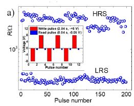" The microelectronics industry is currently searching for reliable redox-based resistive switching (RS) memories which are filament-free, scale with the electrode size and do not require a high voltage electroforming step. Interface and volume type switching devices are the most promising memristors to achieve these challenging requirements, both for ReRAM (Resistive Random-Access Memories) non-volatile memory and neuromorphic computing applications. Here RS was investigated for the first time in the nanoionic memristors based on GdBaCo2O5+δ (GBCO), an oxide with high oxygen mobility. Non-filamentary and non-volatile reproducible RS was obtained when GBCO is sandwiched between Ag and LaNiO3 (LNO) electrodes. The observed bipolar RS could be successfully induced both by voltage sweeps and by pulses, showing asymmetric clock-wise hysteretic R(V) characteristics at room temperature. The temperature dependence of two independent devices in high and low resistance states (HRS and LRS) revealed a gradual decrease of the resistance difference between the two states on cooling from room temperature to 150 K and its increase below 100 K. Similarly, the R(V) switching curves obtained at low temperature showed the disappearance of the hysteresis at 150 K and its reappearance at lower temperatures. The superposition of volume and interface type RS mechanisms have proven to be responsible for the observed non-volatile change of the remnant resistance. The volume-type RS was related to the variation of the GBCO resistivity due to a change in oxygen content. The interface-type RS, on the other hand, was associated to the created electronic and ionic conduction barrier between GBCO and LNO bottom electrode. "