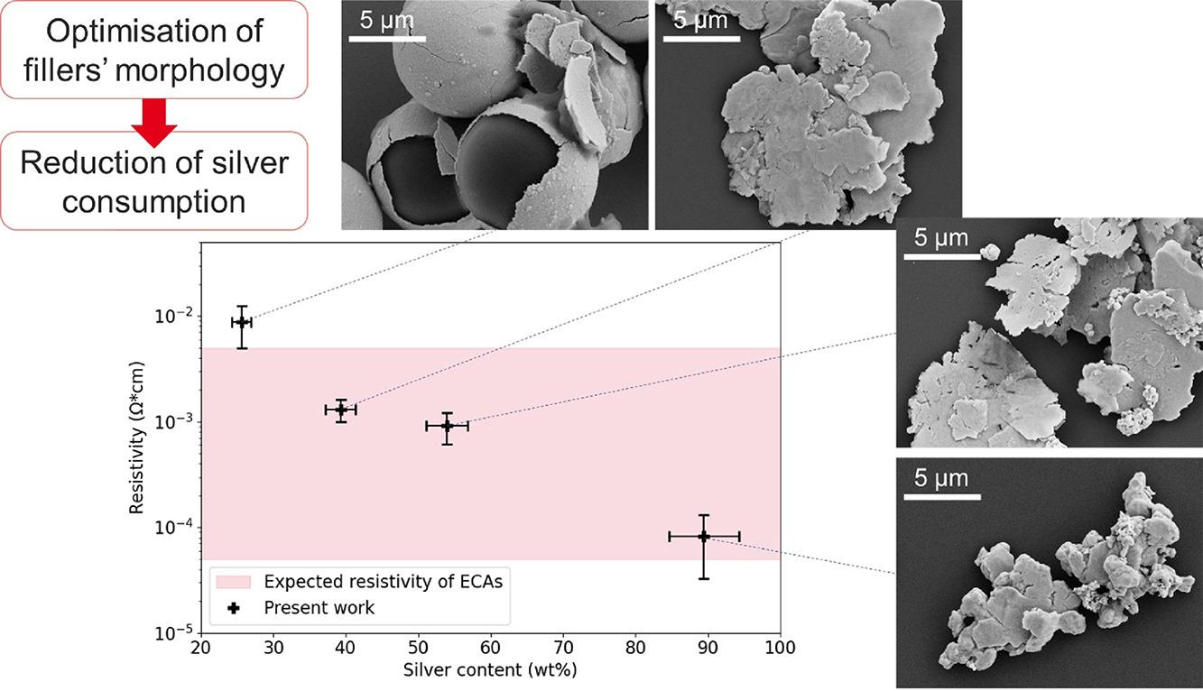 We showed that some ECAs can contain silver particles with tortuous shapes, while others contain optimised particles with flaky or core–shell morphologies, often under the form of a mix of particles with various sizes and shapes. Resistivities down to (8.18 ± 4.91) × 10-5 Ω cm were measured for ECAs containing more than 50 wt% silver. Conductive behaviours can be obtained along with reduced silver contents as low as (25.6 ± 1.3) wt% when optimised fillers are used to make ECAs."