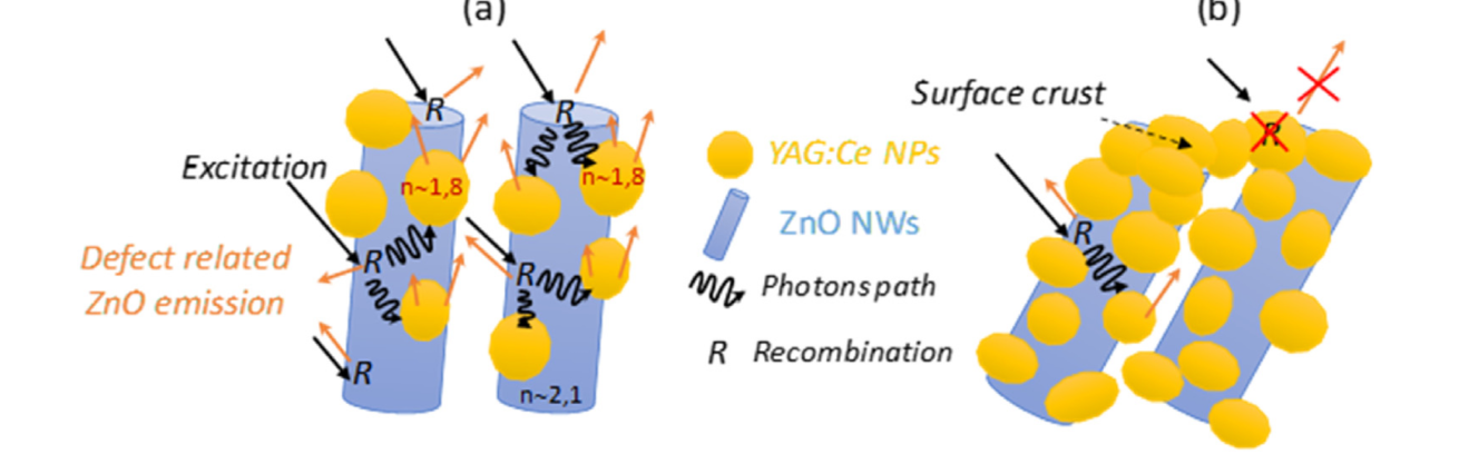 "Luminescent ZnO nanowires (NWs)/YAG:Ce heterostructure coatings have been elaborated by impregnating cheap hydrothermally-grown ZnO NWs array with ground commercial YAG:Ce nanoparticles (NPs). TEM and photoluminescence quantum yield measurements have been used to make YAG:Ce NPs suitable for soaking within the ZnO NWs. Structural, morphological and optical studies of functional nanocomposite coatings have evidenced an optimal amount of YAG:Ce allowing the visible photo-luminescence signal of ZnO NWs nearly to triple whereas slight red shift accompanied by an enlargement on the long wavelength side has been observed for YAG:Ce emission. These phenomena have been explained through the existence of structural defects on ZnO NWs surface and emission mechanisms implying either scattering effects or the passivation of NWs surface by YAG:Ce NPs. Furthermore, an energy diagram involving different structural defects of ZnO NWs as well as Ce3þ ions energy levels has been built from excitation and emission spectra and from decay curves recorded monitoring the orange-red emission of ZnO. The elaborated heterostructure functional coatings have proved to exhibit tunable optical properties in terms of spectral distribution playing on the excitation source. Hence, they appear as a smartway for developing LEDs-based devices with flexible photometric parameters for a broader range of optical applications."