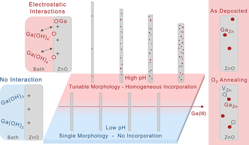 "ZnO nanowires grown by chemical bath deposition (CBD) are of high interest, but their doping with extrinsic elements including gallium in aqueous solution is still challenging despite its primary importance for transparent electrodes and electronics, and for mid-infrared plasmonics. We elucidate the formation mechanisms of ZnO nanowires by CBD using zinc nitrate and hexamethylenetetramine as standard chemical precursors, as well as gallium nitrate and ammonia as chemical additives. A complete growth diagram, revealing the effects of both the relative concentration of gallium nitrate and pH, is gained by combining a thorough experimental approach with thermodynamic computations yielding theoretical solubility plots as well as Zn(II) and Ga(III) speciation diagrams. The role of Ga(OH)4– complexes is specifically shown as capping agents on the m-plane sidewalls of ZnO nanowires, enhancing their development and hence decreasing their aspect ratio. Additionally, the gallium incorporation into ZnO nanowires is investigated in detail by chemical analyses and Raman scattering. They show the predominant formation of gallium substituting for zinc atoms (GaZn) in as-grown ZnO nanowires and their partial conversion into GaZn–VZn complexes after postdeposition annealing under oxygen atmosphere. The conversion is further related to a significant relaxation of the strain level in ZnO nanowires. These findings reporting the physicochemical processes at work during the formation of ZnO nanowires and the related gallium incorporation mechanisms offer a general strategy for their extrinsic doping and open the way for carefully controlling their physical properties as required for nanoscale device engineering."