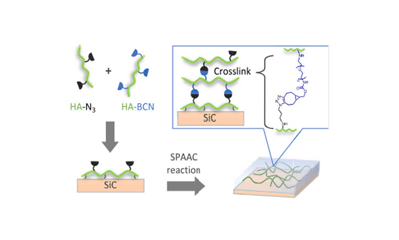 "The reliability and long-term stability of neural probes after in vivo implantation depend first and foremost on the tissue-device interface, which can be improved by the development of hybrid inorganic/organic material interfaces. We report the deposition process of hyaluronic acid (HA) hydrogel film as a biomimetic polymer on amorphous SiC (a-SiC) film. This is a two-step process involving first the covalent immobilization of an azide-modified HA derivative (HA-N3) which is followed by deposition of a cross-linked HA hydrogel film obtained by a strain-promoted azide-alkyne cycloaddition (SPAAC) reaction. Prior the a-SiC surface was modified with an amino-silane (APTES) enabling the covalent grafting of HA-N3 on a-SiC. The step-by-step modification of the a-SiC surface properties has been investigated. The chemical modification is evidenced by XPS measurements and Raman spectra, which demonstrate the presence of an homogeneous HA film with expected chemical environments for C, N and O elements. The surface morphology modification is characterized by an increase of roughness going from 1 nm to 45 ± 3 nm (RMS). These changes in chemical composition and roughness result in an increase in wettability giving a low contact angle value of 26.4° with low dispersion, indicating that the HA layer is hydrophilic and homogeneous. The high initial stiffness of the a-SiC film is reduced by 103, leading to a Young's modulus of ∼6 kPa obtained from nano-indentation measurements. This local AFM data was compared to the bulk rheological properties to get insights about deformation modes in the HA network. These preliminary results demonstrate the success of the process and pave the way for further experiments, which will focus on the in vitro and in vivo impact of the biopolymer coating on neural cell attachment and growth."