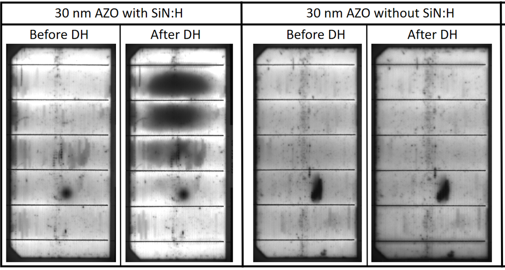 "In this work, we investigate the possibility of replacing Indium-rich transparent conductive oxides (TCO) with previously untested thin aluminum-doped zinc oxide (AZO) layers (50–30 nm) as a way to remove Indium in SHJ solar cells and modules. In order to maintain optical properties and possibly to increase the damp heat reliability of the modules using those thin AZO layers, optically optimized SiNx:H capping layers were used. The AZO deposition conditions were fine-tuned (varying the gas flows), and the best AZO/SiNx:H combinations were then selected based on the output of optical simulations, fed with characterization results. On the front side, when deposited on the classical (n) a-Si:H selective layers, the thinner AZO layers yielded lower FF due to higher contact resistivity as well as higher Rsheet. However, when deposited on (n) nc-Si:H, the contact resistivity was drastically lowered, allowing cells with 30 nm AZO layers to achieve comparable efficiencies as the cells incorporating ITO layers both at cell (22.88 %) and module (21.67 %) scale. On the rear side, the AZO layers yielded −0.5 %abs efficiency losses compared to the reference cells, due to both FF and Jsc losses. Reliability tests in damp heat environment (up to 1000 h) were conducted and showed that on the front side, thinner AZO layers show increased sensibility to humidity, and that SiNx:H layers increase the degradation. On the rear side, AZO layers suffer less from humidity degradation, and the resistance is enhanced with a 10 nm ITO capping layer."