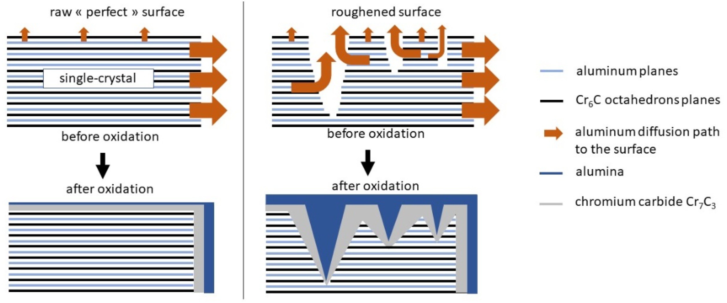 "High-temperature oxidation of bulk single crystal, fine and coarse grained polycrystals of Cr2AlC has been performed from 800 °C to 1500 °C. In the temperature range T = [800;1400] °C, an α-Al2O3 scale with a Cr7C3 subscale are in-situ formed independently of the initial microstructure on top of the bulk Cr2AlC. CALPHAD calculations were performed to explain the formation of Cr7C3 instead of the expected mixture of carbides, indicating a favourable driving force for Cr7C3 formation. The kinetic study of the oxidation is consistent with previous works with an activation energy of about 400 kJ.mol−1. Oxidizing for a longer time (1000 h) or at higher temperature (1500 °C) leads to the formation of chromia in the former alumina scale, which correspond to the calculated equilibrium phases."