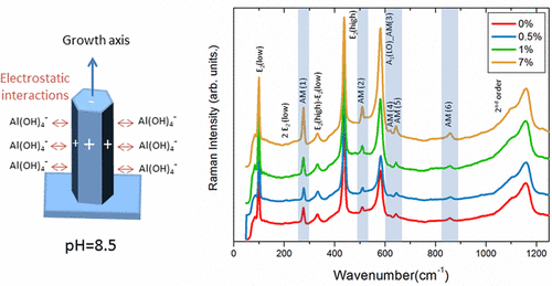 "Mastering the properties of ZnO nanowires grown by the low temperature chemical bath deposition (CBD) is of crucial importance but is still challenging. We show that the shape, dimensions, and doping of ZnO nanowires can simultaneously be tuned by the addition of aluminum nitrate in the standard chemical system using zinc nitrate, hexamethylenetetramine, and ammonia in aqueous solution. The formation and doping mechanisms of ZnO nanowires are thoroughly investigated by combining chemical, structural, and optical analyses with in situ pH measurements correlated with thermodynamic simulations. We reveal that the electrostatic interactions of Al(OH)4– complexes with the positive m-plane sidewalls of ZnO nanowires at a given pH favor their adsorption as capping agents, reducing the radial growth and promoting the elongation, while favoring the aluminum uniform incorporation. Importantly, the aluminum doping is found to be thermally activated above the low temperature of 200 °C under oxygen atmosphere, as indicated by the occurrence of six related additional modes in the range of 200–900 cm–1 in temperature-dependent Raman spectroscopy. These findings show that CBD using aluminum nitrate is of high potential for tuning both the morphology of ZnO nanowires and their physical properties via the aluminum doping, which paves the way for their more efficient use into sensing, electronic, and optoelectronic devices on both flexible and rigid substrates."
