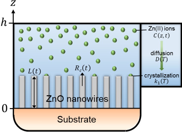 "The formation of nanowires by chemical bath deposition is of great interest for a wide variety of optoelectronic, piezoelectric, and sensing devices, from which the theoretical description of their elongation process has emerged as a critical issue. Despite its strong influence on the nanowire growth kinetics, reactor size has typically not been taken into account in the theoretical modeling developed so far. We report a new theoretical description of the axial growth rate of nanowires in dynamic conditions based on the solution of Fick’s diffusion equations, implementing a sealed reactor of finite height as a varying parameter. The theoretical model is applied in various chemical bath deposition conditions in the case of the growth of ZnO nanowires, from which the influence of the reactor height is investigated and compared to experimental data. In particular, it is found that the use of reactor heights smaller than 2 cm significantly decreases the ZnO nanowire axial growth rate in typical experimental conditions due to the faster depletion of reactants. The present approach is further used predictively, showing its high potential for the design of batch reactors for a wide variety of chemical precursors and semiconductor materials in applied research and industrial production."