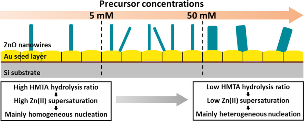 "The ability to form ZnO nanowire arrays with dedicated morphological properties is crucial for the development of efficient piezoelectric devices such as piezoelectric nanogenerators and sensors. However, their integration typically requires the use of metallic seed layers for their synthesis by chemical bath deposition, from which their morphological control is still very limited. In this context, the formation mechanisms of ZnO nanowires from Au seed layers are carefully investigated for different precursor (i.e., zinc nitrate and hexamethylenetetramine (HMTA)) concentrations in the range of 1–100 mM, where drastic variations of the morphological properties are observed. By coupling in situ pH measurements and thermodynamic computations, we perform an in-depth analysis of the thermodynamic properties of the chemical bath, where the predominant role of the NO3– ions in the evolution of the pH of the chemical bath is revealed. An original approach is further developed to carefully determine the hydrolysis ratio of HMTA molecules, which is found to vary in the range of 20–45% with the precursor concentration, and to directly impact the supersaturation ratio of Zn(II) species. From these results, we identify the presence of three different growth regimes depending on the precursor concentrations, each of them giving rise to ZnO nanowire arrays with specific morphological properties. These results highlight the critical importance of the thermodynamic properties of the chemical bath in the formation process of ZnO nanowires from Au seed layers and provide key elements of understanding to efficiently optimize their morphology for their integration into piezoelectric devices."