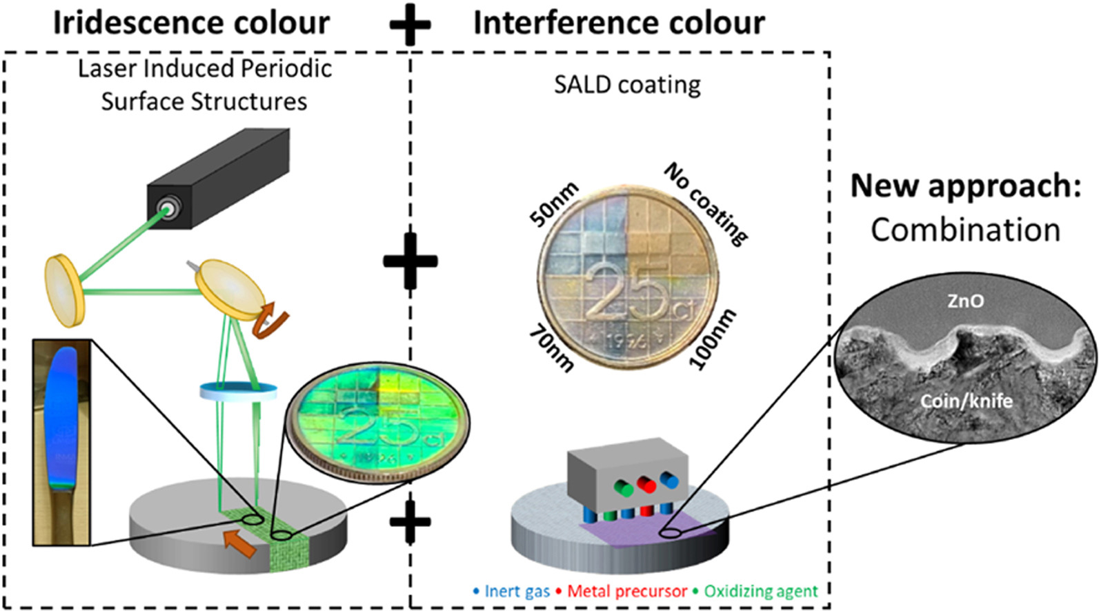 "This work studies the combination of direct femtosecond laser structuring of metal surfaces and Spatial Atomic Layer Deposition (SALD) of metal oxides as a novel approach to generate colours on different types of day-to-day metallic objects. In particular, a stainless-steel knife and an outdated 25 ct Dutch florin coin have been selected for the study. Our results show that it is possible both, to preserve the iridescence properties produced by laser processing and to tune the final metal surface colour by controlling the thickness of the ZnO coating. At the same time, this oxide coating could act as a protecting layer for the original material. We thus explore two different strategies to generate colour, namely, iridescence and interference, which can be even developed selectively. This novel methodology to colour metallic surfaces is a promising route to achieve cheap, scalable, and high-throughput processing methods and opens up a new avenue of possibilities and applications related to colour."