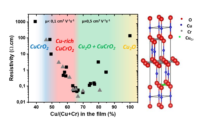 "In this work, we report the enhancement of functional properties of CuCrO2, a promising p-type conductive and transparent oxide, achieved in out of stoichiometry CuCrO2 thin films synthesized by aerosol-assisted chemical vapor deposition. Out of stoichiometry films consisting in Cr-deficient i.e. Cu-rich CuCrO2 phase, have a resistivity of 0.05 Ω.cm and an average transmittance of 58% in the visible range, resulting in a Gordon’s Figure of Merit of 2200 µS. This is the highest ever published Figure of Merit among Cu-rich CuCrO2 synthesized by chemical methods. A remarkable result is that when further increasing the Cu/(Cu+Cr) ratio , the formation of CuO was non detected, allowing the synthesis of composite films formed by Cu2O and CuCrO2p-type oxides, which are more conductive than the Cu-rich CuCrO2 phase. These nanocomposite films present an improved carrier mobility, with a resistivity around 0.02 Ω.cm, and a reduced energy gap, with a transmittance of 52%, resulting in a Figure of Merit of 1400µS. Both of these thin films can find application as hole transport layer in various transparent optoelectronic devices where p-type TCOs are required, specially when synthesized by a solution-based process at low temperature and ambient pressure over large surface areas."