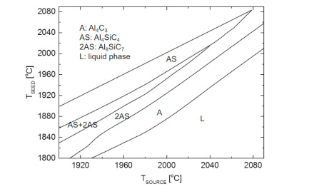 "Al4SiC4 is a refractory ceramic with a reported band gap of about 2.5 eV, making it an interesting semiconductor material for various applications in the field of energy. However, the synthesis of Al4SiC4 single crystals has so far not been investigated. In this study, the sublimation growth method is explored as a potential route for getting high quality single crystals. Combining a thermodynamic analysis with an extensive experimental approach, the vaporization and condensation phenomena in the Al4C3 – SiC system are described. Experimental conditions, such as initial composition, baking temperature and temperature gradient, are investigated and demonstrated regarding the crystallization of Al4SiC4. From the results obtained, a condensed phase diagram at equilibrium is established for the molar fraction XAl4C3/(Al4C3+SiC) < 0.5, which corresponds to the suitable condition for the Al4SiC4 condensation. Indeed, Al4SiC4 single phase could be experimentally condensed either by self-nucleation or as oriented film on SiC substrates."
