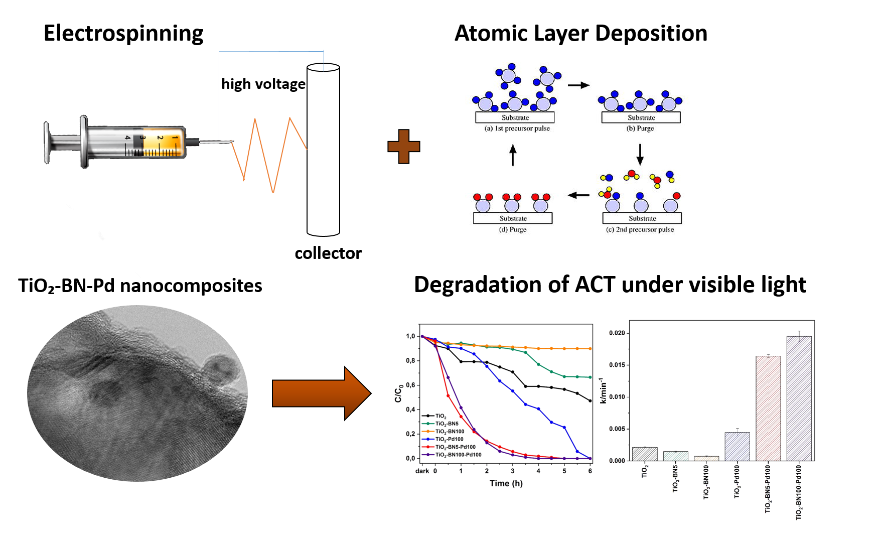 "The demand for fresh and clean water sources increases globally, and there is a need to develop novel routes to eliminate micropollutants and other harmful species from water. Photocatalysis is a promising alternative green technology that has shown great performance in the degradation of persistent pollutants. Titanium dioxide is the most used catalyst owing to his attractive physico-chemical properties, but this semiconductor presents limitations in the photocatalysis process due to the high band gap and the fast recombination of the photogenerated carriers. Herein, a novel photocatalyst has been developed, based on titanium dioxide nanofibers (TiO2 NFs) synthesized by electrospinning. The TiO2 NFs were coated by atomic layer deposition (ALD) to grow boron nitride (BN) and palladium (Pd) on their surface. The UV-Vis spectroscopy measurements confirmed the increase of the band gap and the extension of the spectral response to the visible range. The obtained TiO2/BN/Pd nanofibers were then tested for photocatalysis, and showed a drastic increase of acetaminophen (ACT) degradation (>90%), compared to only 20% degradation obtained with pure TiO2 after 4h of visible light irradiation. The high photocatalytic activity was attributed to the good dispersion of Pd NPs on TiO2-BN nanofibers, leading to a higher transfer of photoexcited charges carriers and a decrease of photogenerated electron-holes recombination. To confirm their reusability, recycling tests on the hybrid photocatalyst TiO2/BN/Pd have been performed, showing a good stability over 5 cycles under UV and Visible light. Moreover, toxicity tests as well as quenching tests were carried out to check the toxicity in the formation of byproductsand to determine active species responsible for the degradation. The results presented in this work demonstrate the potential of TiO2/BN/Pd nanomaterials, and open new prospects for the preparation of tunable photocatalysts."