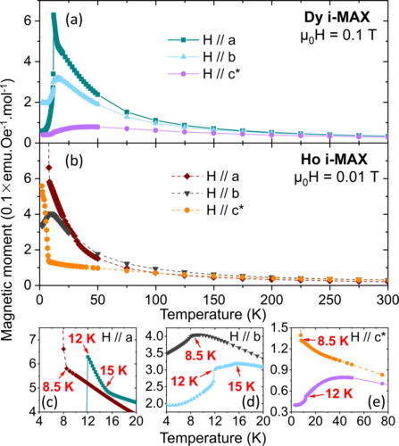 "We report on the magnetic properties of single crystals of Ho- and Dy-based (Mo2/3R1/3)2AlCi−MAX phases. In these nanolamellar compounds, where planes of R and Mo arranged in a skewed triangular lattice are separated by planes of Al and C, geometrical frustration and magnetic exchange interactions lead to complex magnetic properties. Temperature-dependent bulk magnetization, specific heat, and resistivity measurements reveal two magnetic phase transitions in Dy i−MAX (15 and 12 K) and only one in Ho i−MAX (8.5 K). Strong magnetic anisotropy and metamagnetic transitions with a step at 13 of saturation moment along the crystal a axis are observed in field-dependent bulk magnetization curves. X-ray magnetic circular dichroism measurements unveil induced moments on Mo and Al, and a quantitative estimation of the orbital and spin moments of Mo based on magneto-optical sum rules suggests an unusual interaction between the R4f and the Mo 4d magnetic moments. Magnetic structures are derived from neutron diffraction measurements, revealing a zero-field incommensurate amplitude modulated order in both compounds, followed by an antiferromagnetic equal-moments structure at lower temperature for Dy i−MAX. The bulk magnetization 13 step is found to be linked to the flip of one R moment out of three within the planes. Detailed phase diagrams for Ho and Dy i−MAX are derived from these measurements."