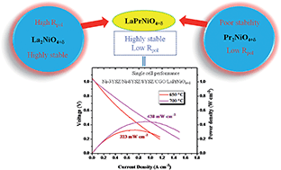 higher electronic conductivity of Pr2NiO4+d. The design consists of stacking of two layers starting with a 3D tree-like microstructure (20 mm thick) over a thin dense base layer (100 nm) fabricated in one step by electrostatic spray deposition (ESD) and then topped by using a screen-printed (SP) current collecting layer of the same composition. X-ray diffraction confirms the formation of a complete solid solution crystallizing in a single phase orthorhombic structure with the Fmmm space group. The thermodynamic stability and polarisation resistance (Rpol) decrease by increasing the Pr content. Among the complete La2xPrxNiO4+d solid solutions, LaPrNiO4+d shows the best compromise between electrochemical properties (the lowest Rpol value available in the literature for this composition, 0.12 U cm2 at 600 C) and thermodynamic stability in air. Moreover, an anode supported single cell (Ni-3YSZ/Ni-8YSZ/8YSZ/CGO) including the LaPrNiO4+d double layer electrode shows a maximum power density of 438 mW cm2 at 700 °C." DOI: 10.1039/C6TA08011A