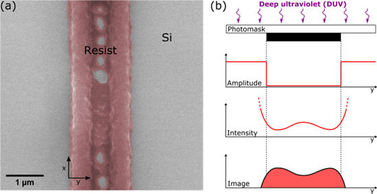 "Scalable fabrication of Si nanowires with a critical dimension of about 100 nm is essential to a variety of applications. Current techniques used to reach these dimensions often involve e-beam lithography or deep-UV (DUV) lithography combined with resolution enhancement techniques. In this study, we report the fabrication of <150 nm Si nanowires from SOI substrates using DUV lithography (λ = 248 nm) by adjusting the exposure dose. Irregular resist profiles generated by in-plane interference under masking patterns of width 800 nm were optimized to split the resulting features into twin Si nanowires. However, masking patterns of micrometre size or more on the same photomask does not generate split features. The resulting resist profiles are verified by optical lithography computer simulation based on Huygens−Fresnel diffraction theory. Photolithography simulation results validate that the key factors in the fabrication of subwavelength nanostructures are the air gap value and the photoresist thickness. This enables the parallel top-down fabrication of Si nanowires and nanoribbons in a single DUV lithography step as a rapid and inexpensive alternative to conventional e-beam techniques."