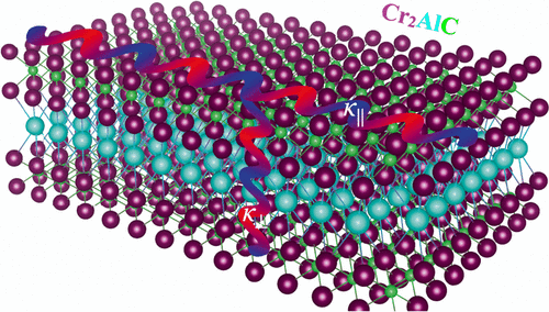 "The temperature dependences of both heat capacity and thermal conductivity in nanolamellar Cr2AlC single crystals are measured using modulated photothermal radiometry and compared to first-principles calculations. The electronic contribution to the thermal conductivity of Cr2AlC single crystals is computed ab initio by determining the electronic transport coefficients using density functional theory and by solving the Bloch−Boltzmann transport equation with a temperaturedependent relaxation time. The lattice thermal conductivity is predicted by going beyond the quasi-harmonic approximation and considering renormalized second- and third-order force constant matrices, with anharmonic three-phonon scattering, isotopic scattering, and scattering by carbon vacancies. Isotopic scattering does not modify the lattice thermal conductivity. In contrast, even a small concentration of carbon vacancies induces a substantial decrease of the in-plane lattice thermal conductivity. The anisotropy measured in the thermal conductivity, with a ratio of ∼2 over the whole temperature range, is confirmed theoretically. This anisotropy seems to mainly arise from lattice contributions. A similar anisotropy is expected for other MAX phases with identical layered structures."