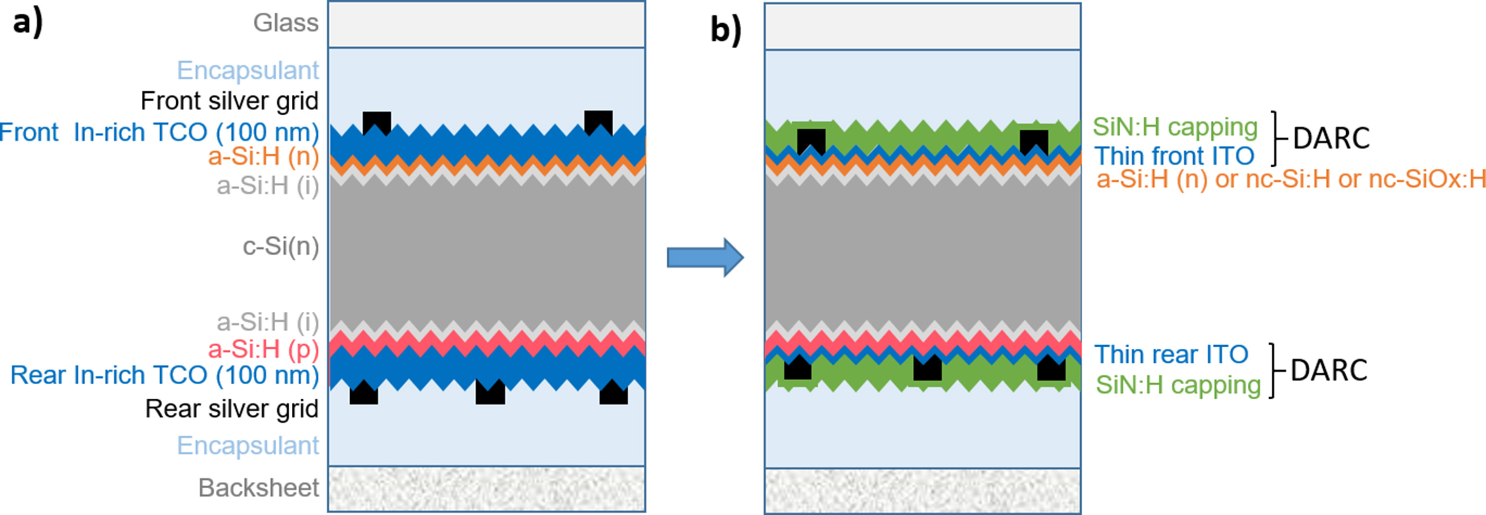 "In this work, we investigate the possibility to drastically decrease the indium (In) consumption in silicon heterojunction (SHJ) solar cells, using ultrathin (<15 nm) ITO layers on both cell sides, in combination with SiN:H capping dielectric layers. The best ITO/dielectric combinations were assessed using optical simulations. The optimal stacks were integrated on front, rear, and both sides of complete SHJ cells. Two types of nanocrystalline layers (nc-Si:H and nc-SiOx:H) were implemented as selective layers on the front side, and proved to relax the constraints on the front ITO conductivity. Among all conditions including 100 nm references, the highest module efficiencies were obtained with 15 nm front ITO (22.4%), while modules with ITO layers below 10 nm on nc-Si:H showed very low efficiency losses compared to the reference. Integration of such ultrathin ITO layers on the rear side proved to be non-optimal since the Fill Factor (FF) losses are not counterbalanced with current gains (contrary to what is observed on the front side with ultra-thin ITO). Finally, UV reliability tests were performed and showed an enhanced reliability for modules with thinner ITO layers. After 60 kW h.m−2 of UV exposure, modules with 5 nm ITO on nc-Si:H showed the best efficiencies among all tested conditions. Subsequent damp heat tests were also performed and did not show a clear warning against using ultrathin ITOs on the front side, and in the end, modules with nc-Si:H layers feature the highest efficiencies at the end of the reliability sequence."