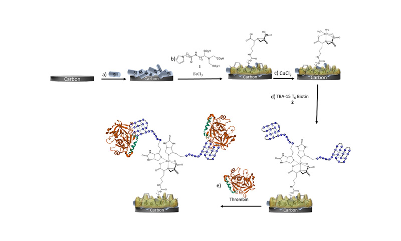"The current study describes the design, analytical characterization, and testing of aptamer sensors based on Si nanonets (Si NN) for thrombin electrochemical detection. Si nanonets are thin sheet arrays of randomly aligned Si nanowires with controlled and programmable properties that may be transported and integrated on a variety of substrates. Si nanonets were placed onto a commercial glassy carbon working electrode to create our aptasensor. Then they were functionalized by conductive pyrrole polymerization, which was followed by aptamer bioreceptor grafting. Electrochemical detection of thrombin was carried out after optimizing the electrode properties. On the one hand, cyclic voltammetry analyses demonstrated a linear association between the acquired current and the logarithm of thrombin concentration from 5 nmol L−1 to 2 µmol L−1. Impedance measurements, on the other hand, revealed a linear relationship between the charge transfer resistance as well as the impedance modulus. Thus, for the first time, Si nanonet thin sheets were used as constitutive nanoporous parts of electrodes capable of detecting thrombin at concentration limits of 5 nM, considered as a risk factor or presence of thrombosis. This demonstrates the concept of using this type of nanomaterial to detect molecules of biological interest."