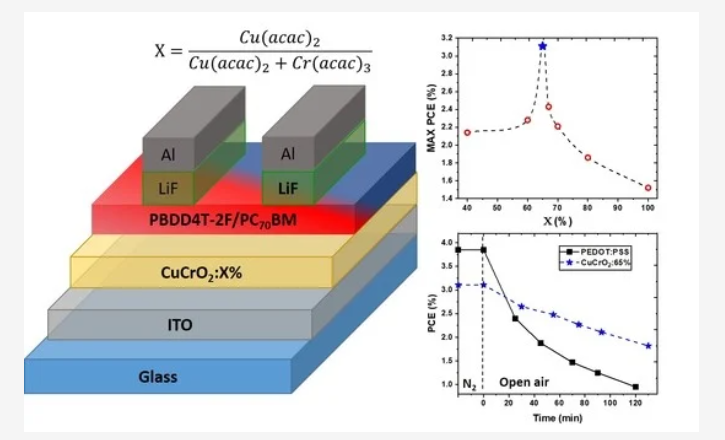 "The performance and stability in atmospheric conditions of organic photovoltaic devices can be improved by the integration of stable and efficient photoactive materials as substituent of the chemically unstable poly (3,4-ethylene dioxythiophene):polystyrene sulfonate (PEDOT:PSS), generally used as organic hole transport layer. Promising candidates are p-type transparent conductive oxides, which combine good optoelectronic and a higher mechanical and chemical stability than the organic counterpart. In this work, we synthesize Cu-rich CuCrO2thin films by aerosol-assisted chemical vapour deposition as an efficient alternative to PEDOT:PSS. The effect of stoichiometry on the structural, electrical, and optical properties was analysed to find a good compromise between transparency, resistivity, and energy bands alignment, to maximize the photovoltaic performances., Average transmittance and bandgap are reduced when increasing the Cu content in these out of stoichiometry CuCrO2films. The lowest electrical resistivity is found for samples synthesized from a solution composition in the 60–70% range. The optimal starting solution composition was found at 65% of Cu cationic ratio corresponding to a singular point in Hackee’s figure of merit of 1 × 10−7Ω−1. PBDD4T-2F:PC70BM organic solar cells were fabricated by integrating CuCrO2films grown from a solution composition ranging between 40% to 100% of Cu as hole transport layers. The solar cells integrating a film grown with a Cu solution composition of 65% achieved a power conversion efficiency as high as 3.1%, representing the best trade-off of the optoelectronic properties among the studied candidates. Additionally, despite the efficiencies achieved from CuCrO2-based organic solar cells are still inferior to the PEDOT:PSS counterpart, we demonstrated a significant enhancement of the lifetime in atmospheric conditions of optimal oxides-based organic photovoltaic devices.."