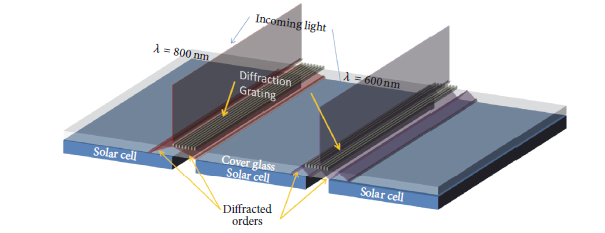 "Solar electricity is one of the most promising renewable energy resources. However, the ratio module’s cost/energy produced remains a major issue for classical photovoltaic energy. Many technologies have been developed to solve this problem, by using micro- or nanostructuring on the solar cell or on the module. These kinds of structuring are often used as antireflection and light-trapping tools. In the meantime, other solar technologies are considered, such as concentration photovoltaic m modules.This article presents a module combining both approaches, that is, nanostructures and concentration, in order to increase the module’s profitability. Sol-gel derived TiO2 diffraction gratings, made by dynamic interferometric lithography, are added on the top of the glass cover to deflect unused light onto the solar cell, increasing the module efficiency."